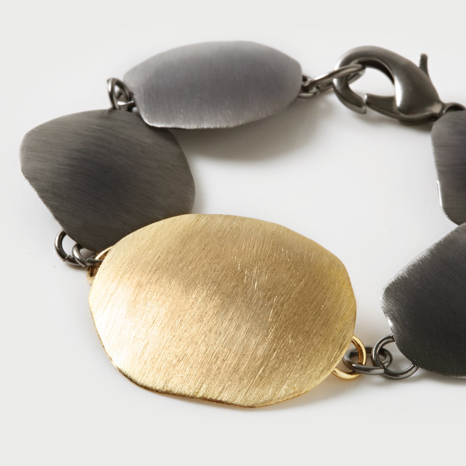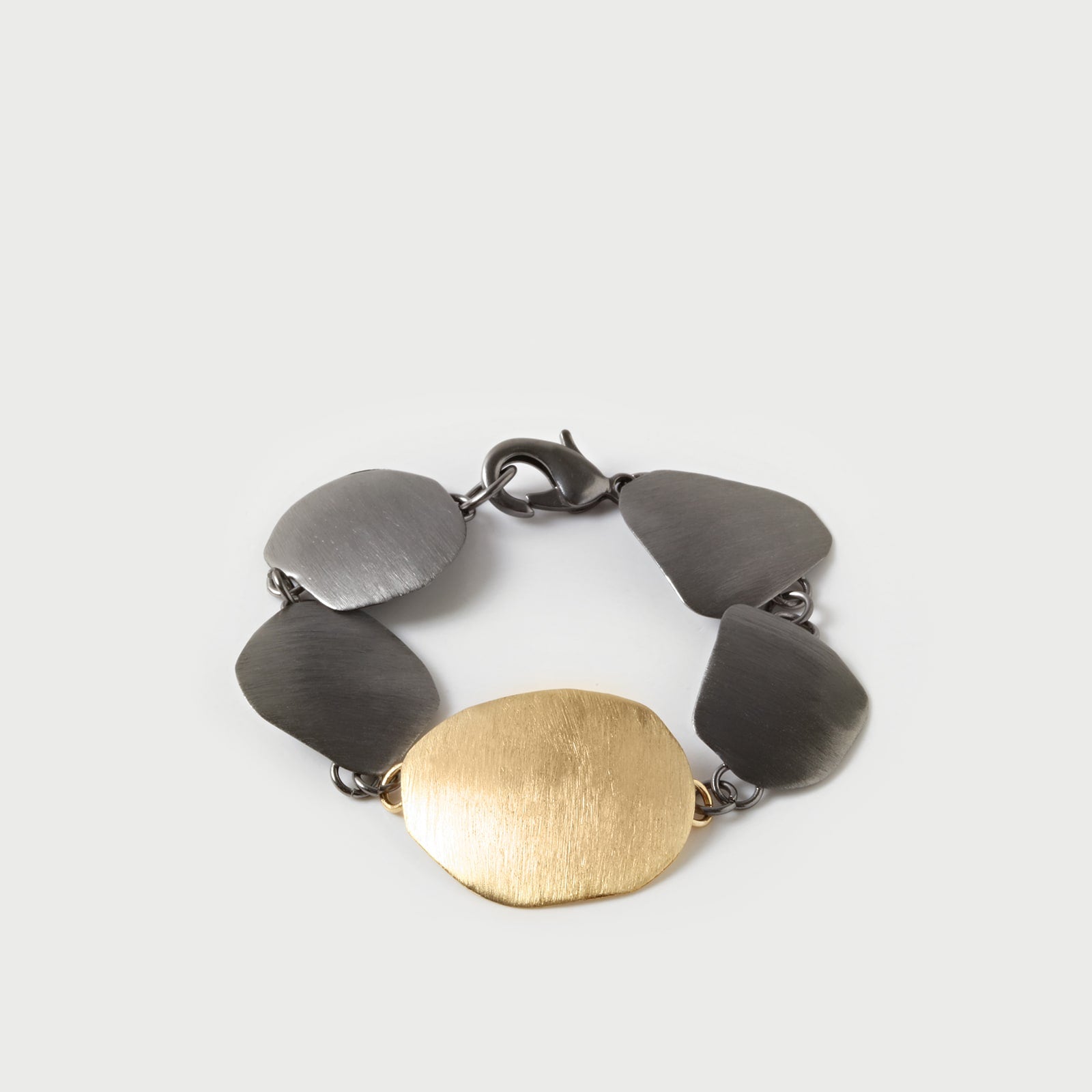 Formele asimetrice din metal formează o brățară cu o personalitate puternică. O notă aurie devine surpriza vizuală într-o piesă de bijuterie care poate adăuga interes stilistic chiar și celor mai simple ținute.