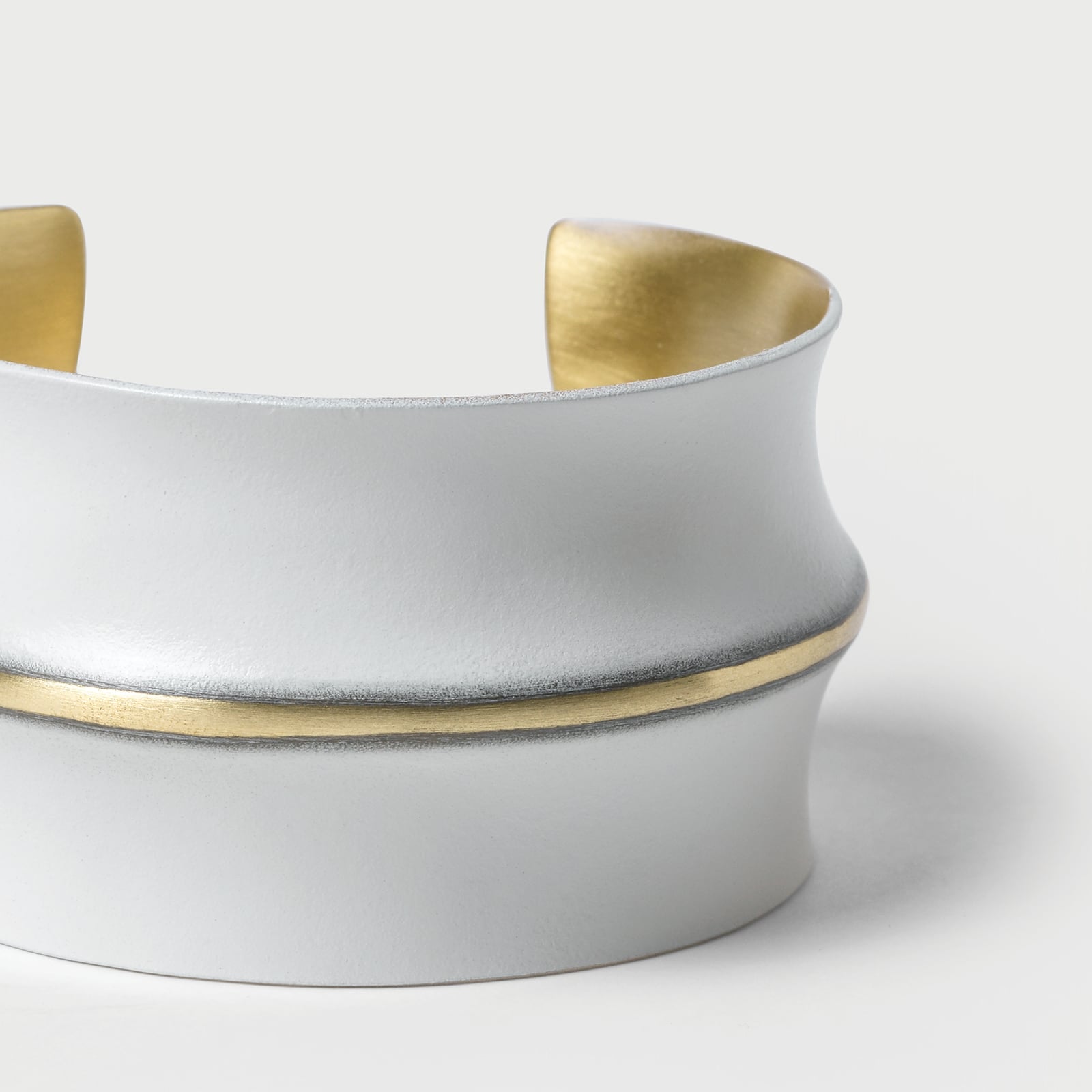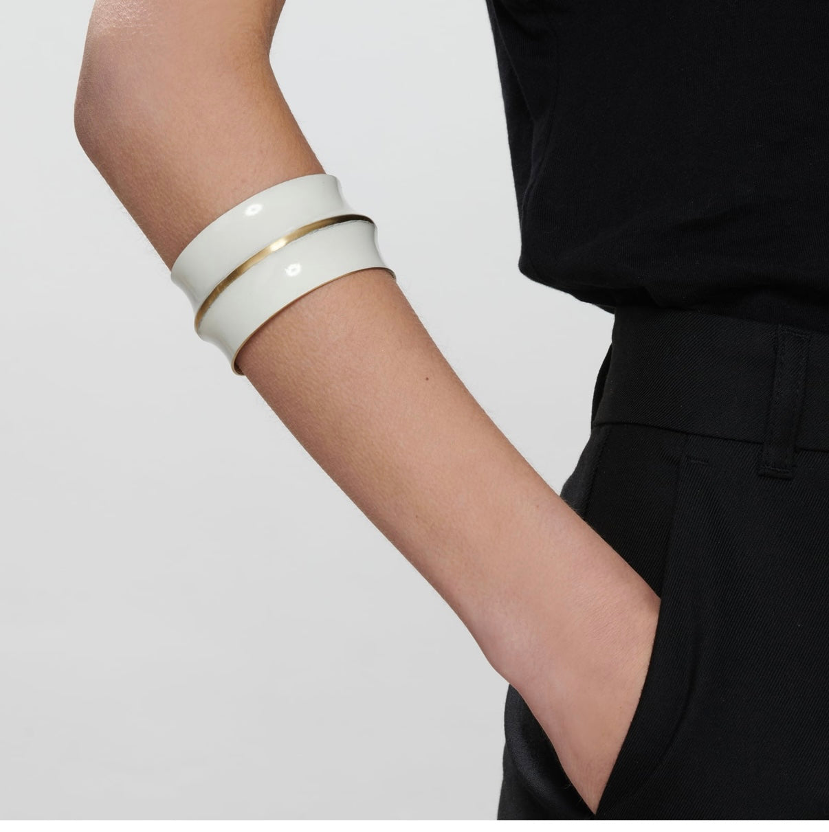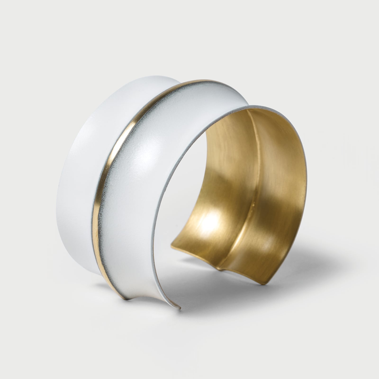 Suprafețele curbate din metal formează o brățară impunătoare, dar elegantă. Puterea estetică a albului este întreruptă de o linie fină de aur într-o piesă de bijuterie cu o personalitate modernă și o mare flexibilitate stilistică.