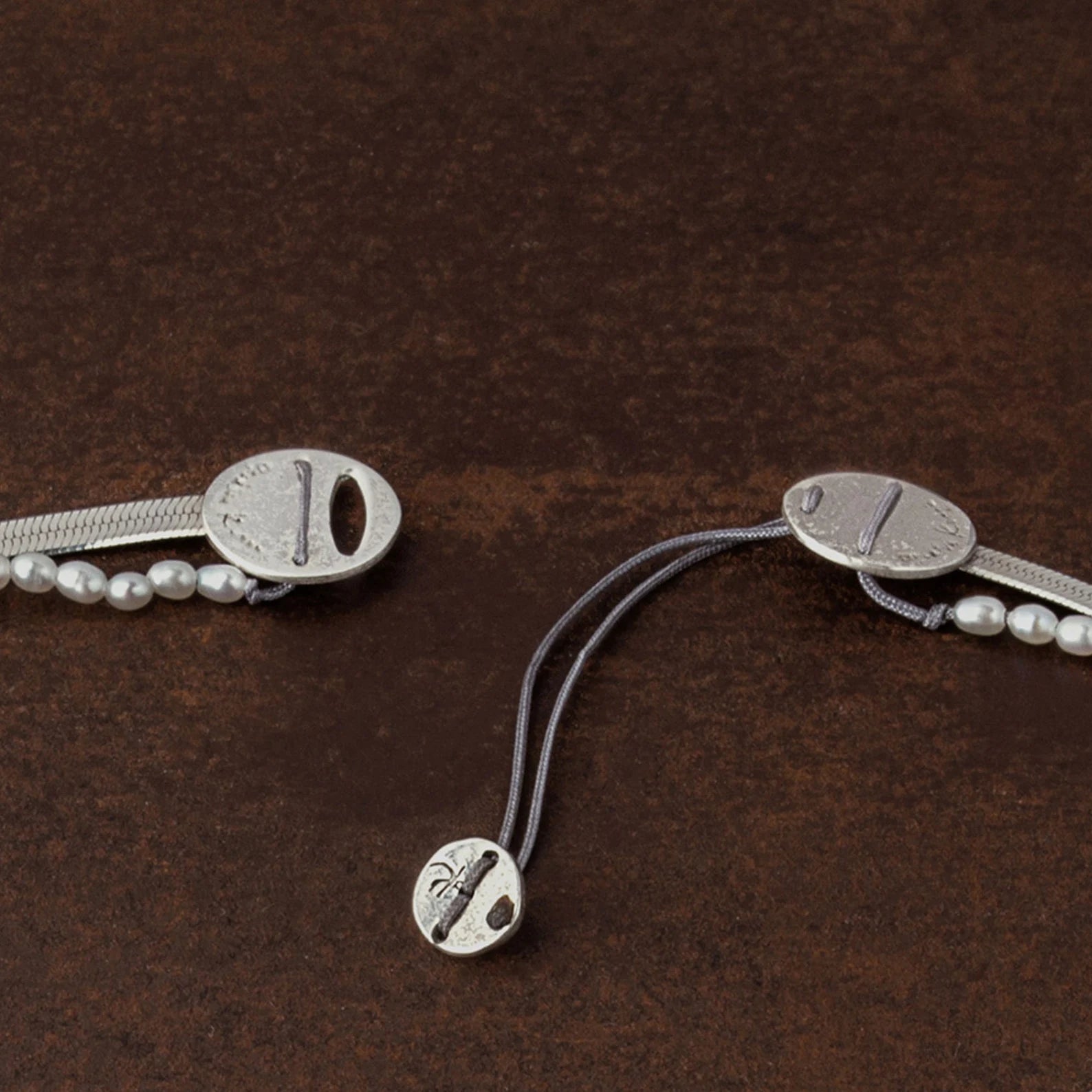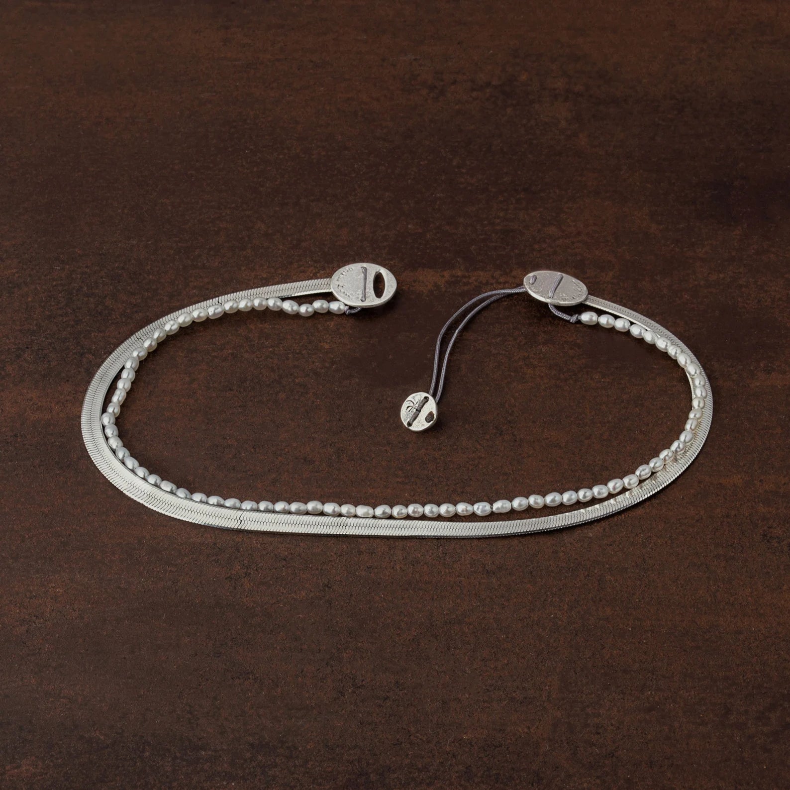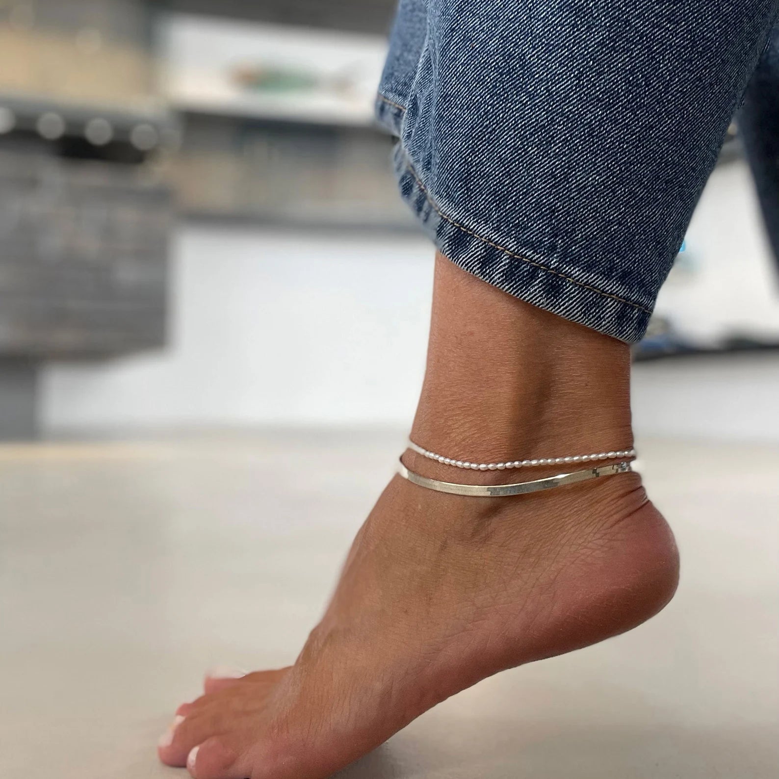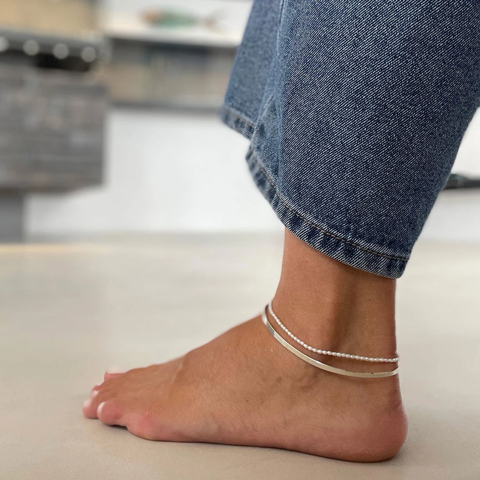 Layers este o brățară de gleznă fină, cu două straturi. Unul dintre straturi este realizat manual cu perle albe ovale de apă dulce, iar celălalt este un lanț tip șarpe din argint sterling lustruit.