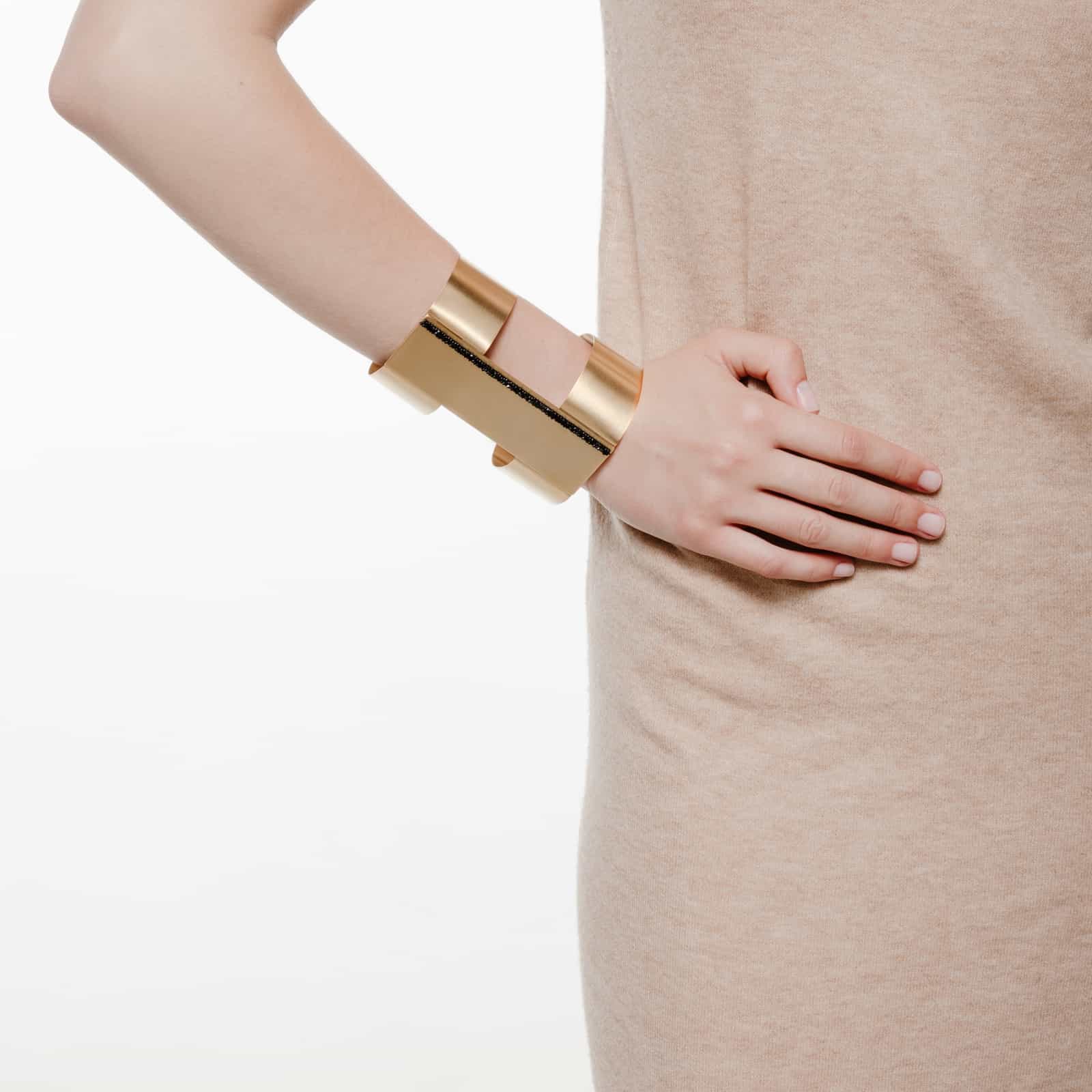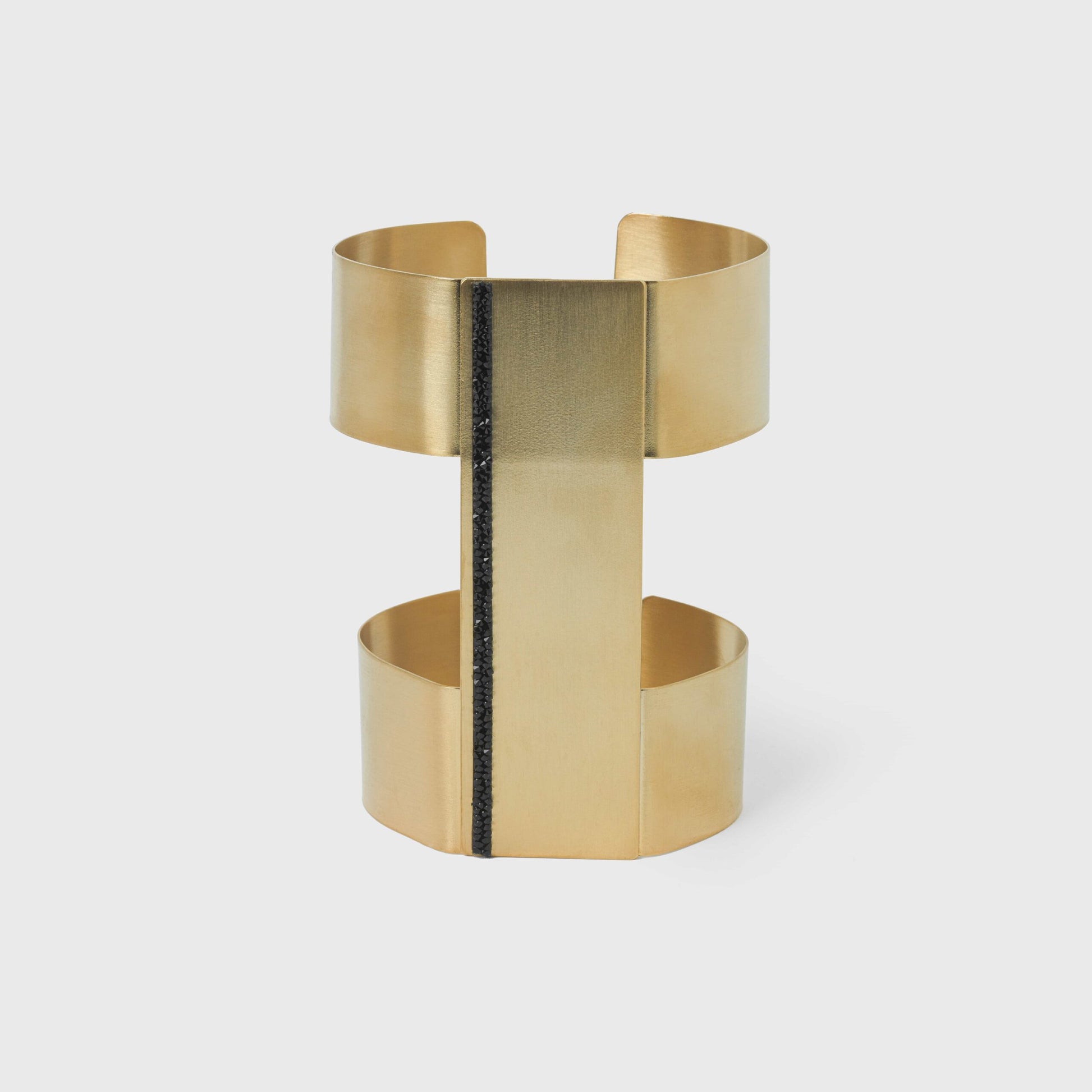 O placă de metal netedă și austera își pune în valoare frumusețea puternică într-o brățară dublă. O linie delicată de cristale adaugă o notă iridescentă într-o piesă de bijuterie care impune stilul prin caracterul său impunător.
