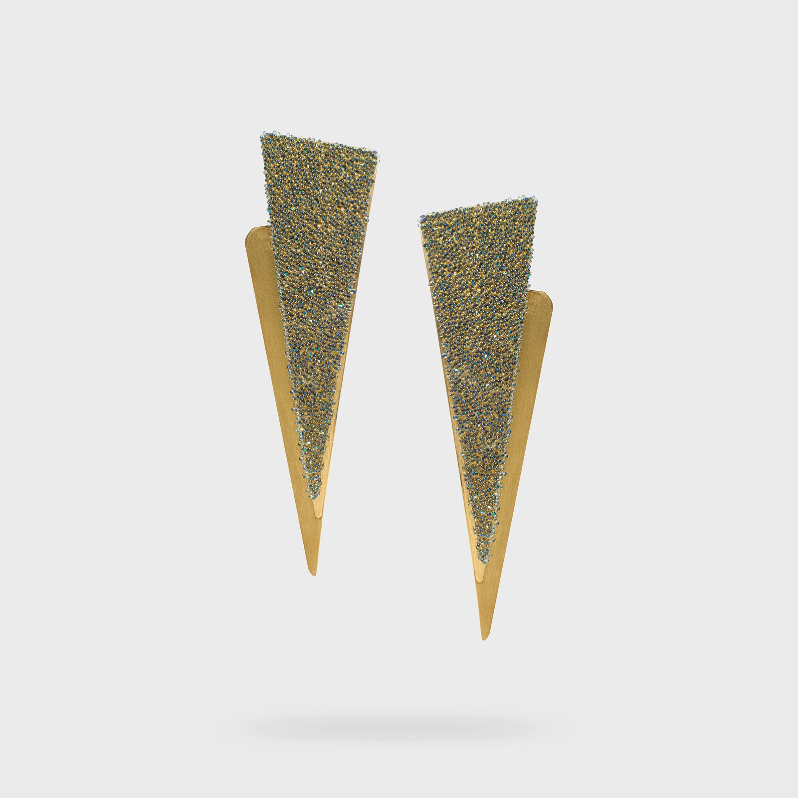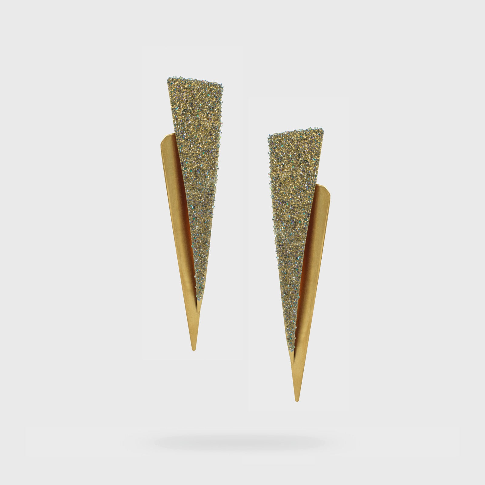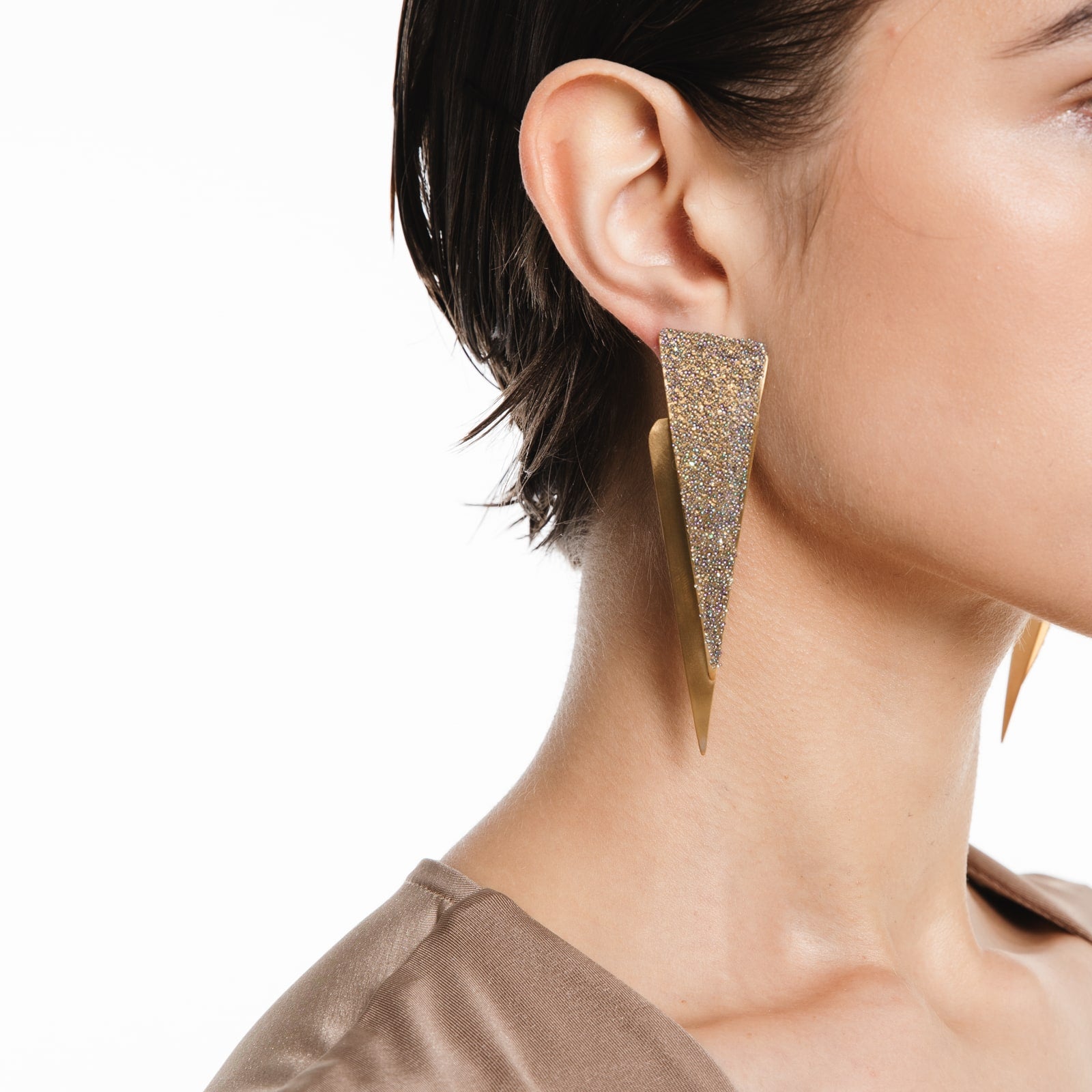 Un triunghi dreptunghic decorat cu o „crustă” fină din cristale, care adaugă strălucirea necesară. O pereche de cercei ce îmbină eleganța rafinată cu o atitudine modernă.