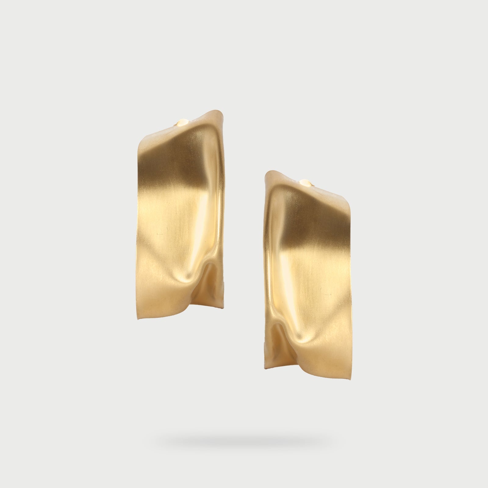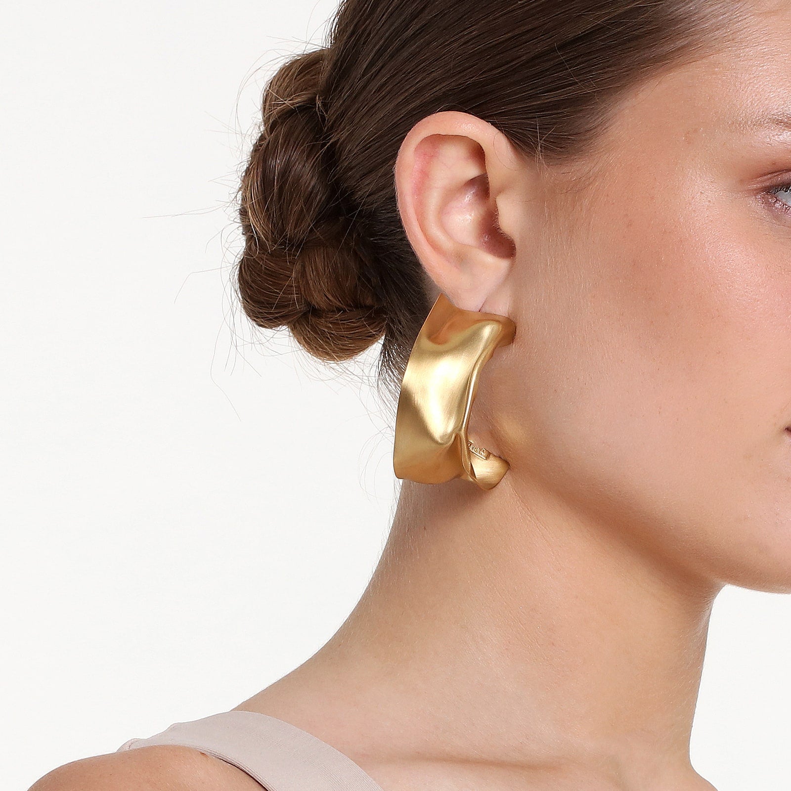 Efectul de „pliuri” reînnoiește cerceii clasici și surprinde prin estetica lor unică. Metalul seamănă cu un material textil, iar „fioriturile” reflectă lumina într-un mod spectaculos, amplificând strălucirea și punând în evidență asocierile avangardiste pe care acest proces interesant le emite. O pereche de cercei care adaugă atitudine și un stil neașteptat look-ului.