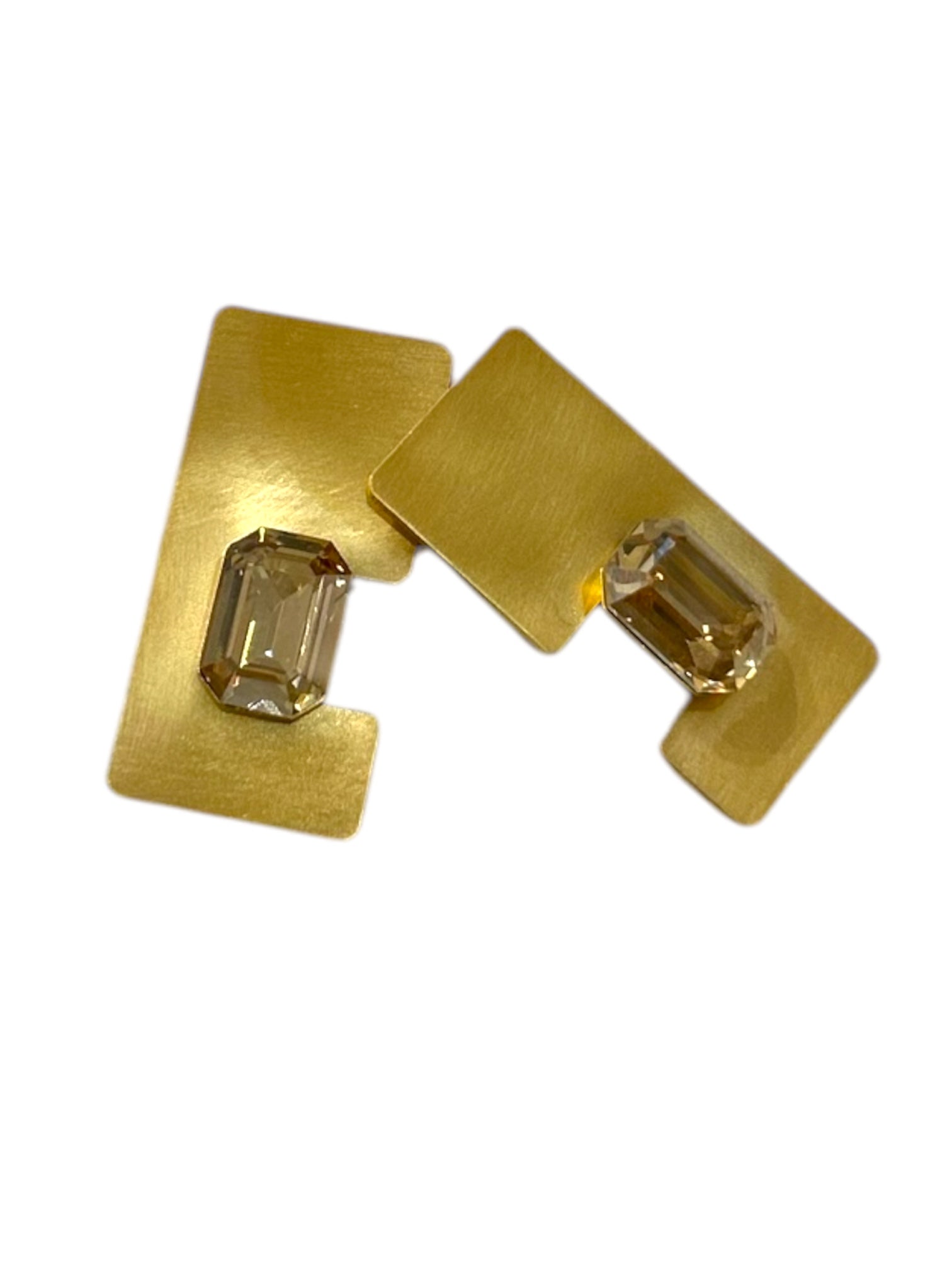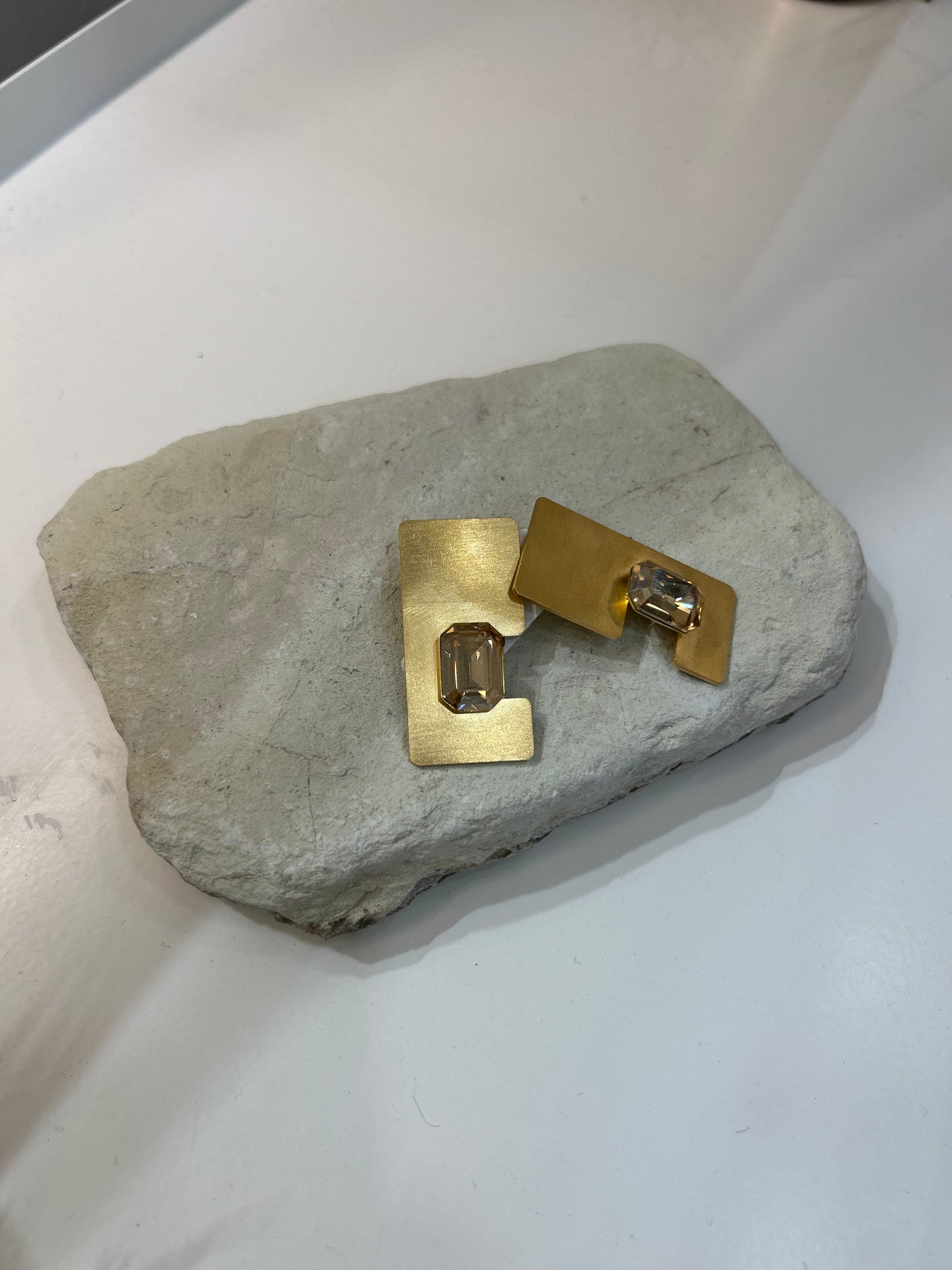 Adaugă un plus de rafinament oricărei ținute cu acești cercei statement, realizați din metal auriu mat cu un design geometric îndrăzneț. Fiecare piesă este accentuată de o piatră rectangulară transparentă, cu tăietură tip emerald, care captează subtil lumina pentru un efect elegant și sofisticat. Perfecți pentru evenimente speciale sau pentru a transforma un outfit simplu într-unul memorabil.