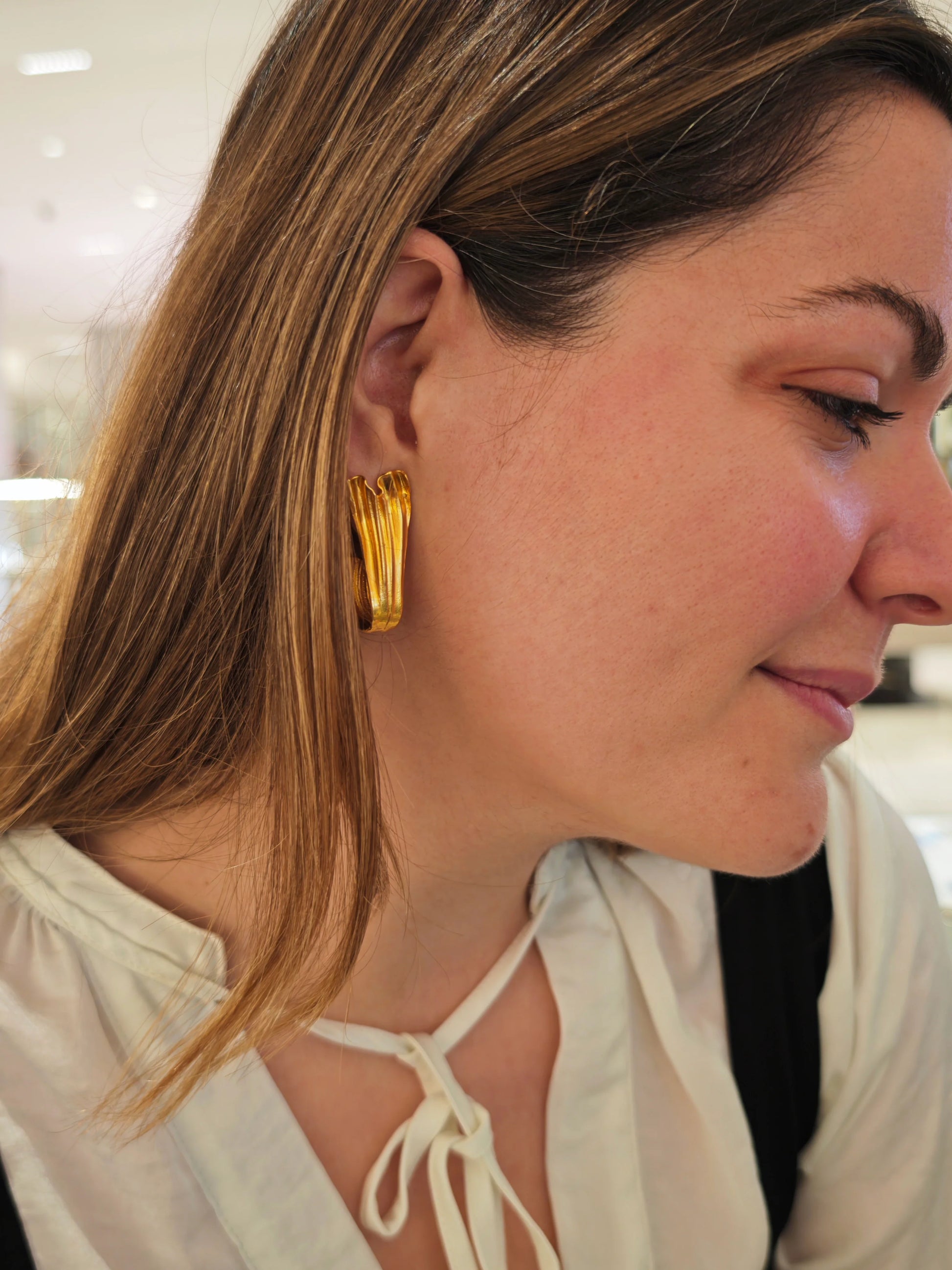 Acești cercei sculptați în argint strălucitor surprind grația faldurilor din veșmintele grecești antice. Ușori și confortabili, reflectă delicat lumina – asemenea țesăturilor fine ce se mișcă în adierea vântului.