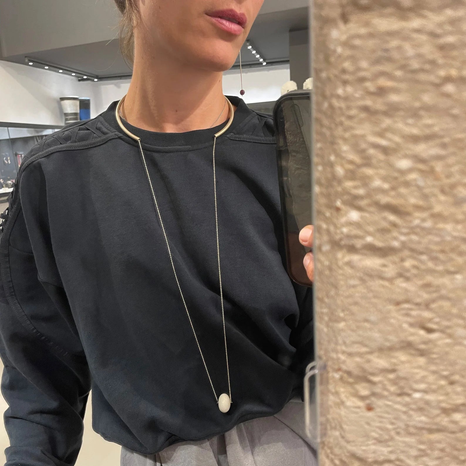 • Colierul poate fi purtat în față, ca un lanț lung, sau invers, astfel încât pietricica să decoreze spatele, iar choker-ul din argint să stea scurt pe gât.