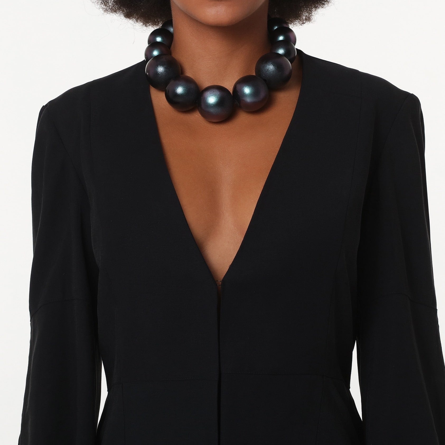 Mărgele mari din lemn cu sclipiri iridescente de culoare mov creează un colier care iese în evidență. O modalitate actualizată de a adăuga atitudine modernă și stil jucăuș ținutei.