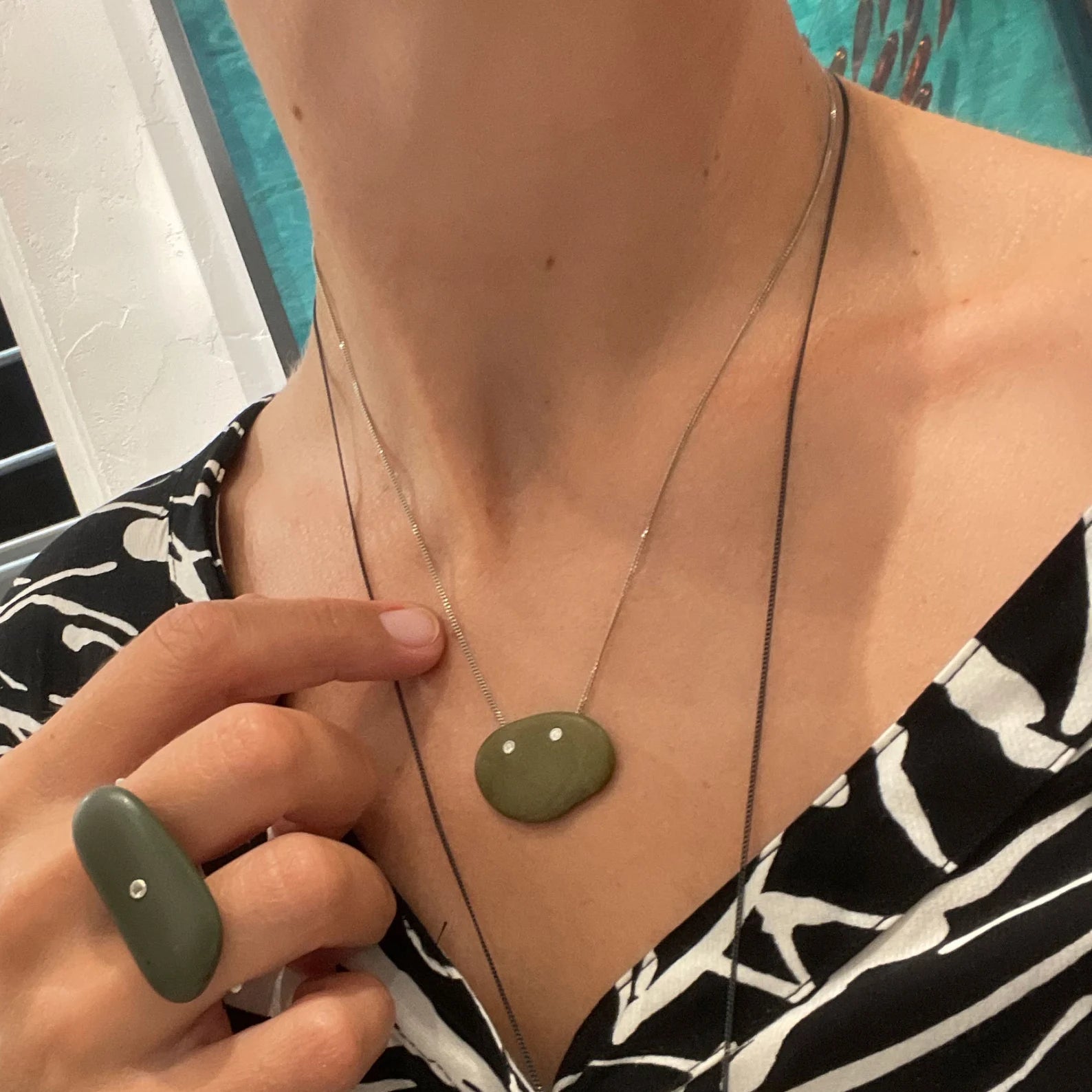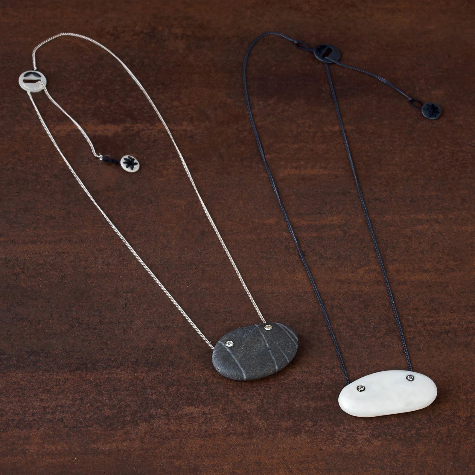 Mourteri Z este un colier spectaculos, realizat din lanț fin de argint sterling și o pietricică de plajă decorată cu doi zirconi.