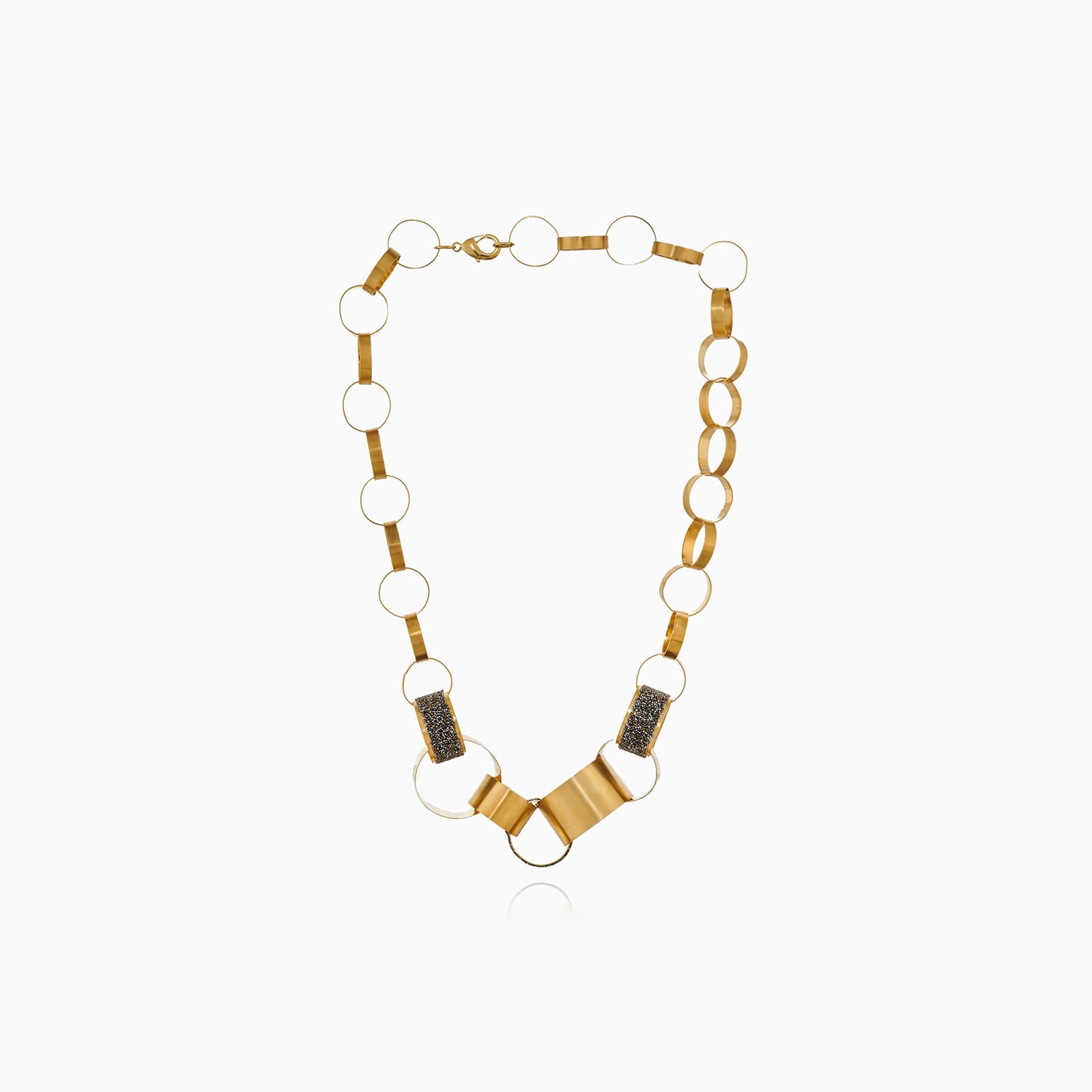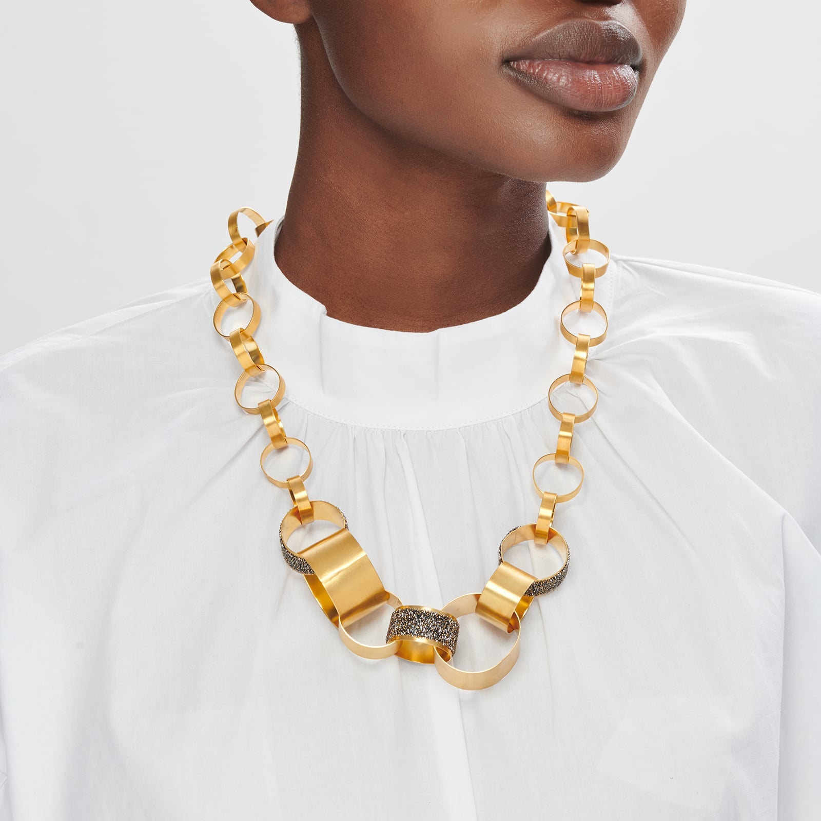 Da, este adevărat; abordarea creativă a unui lanț hardware poate fi realizată într-un mod inovativ și elegant, așa cum dovedește această piesă luxuriantă – și totuși simplă în concept – cu cercuri largi. O flacără aurie, o textură reliefată datorită cristalelor și geometria pură formează un colier statement.
