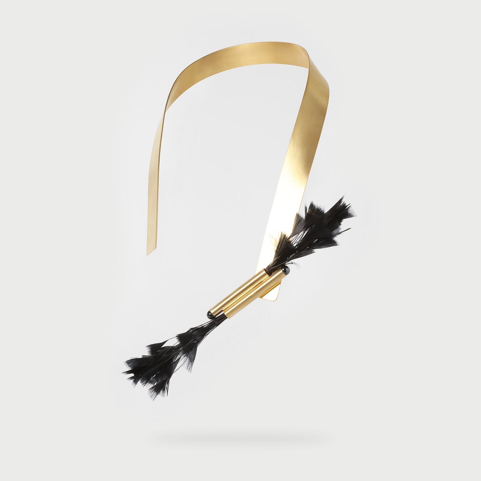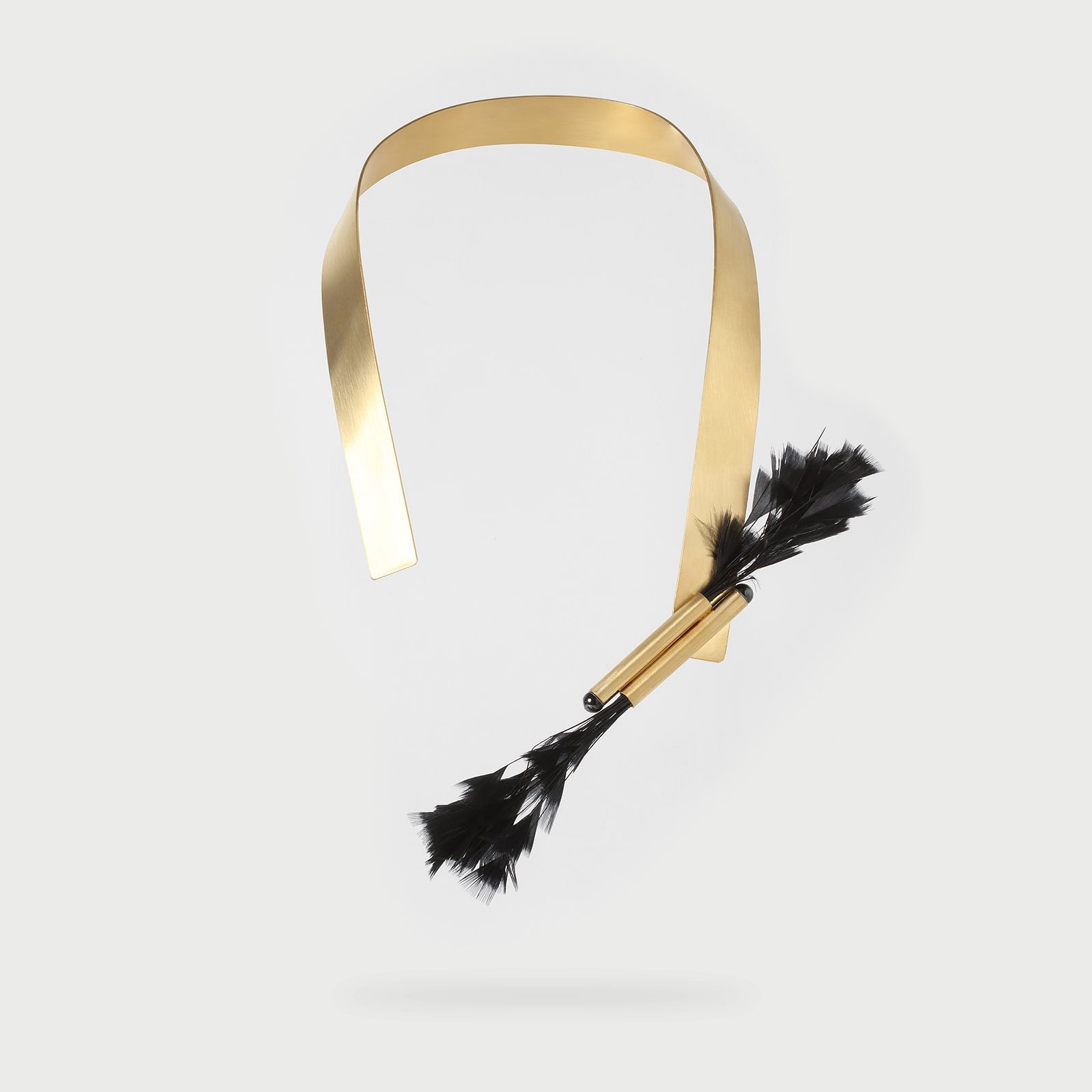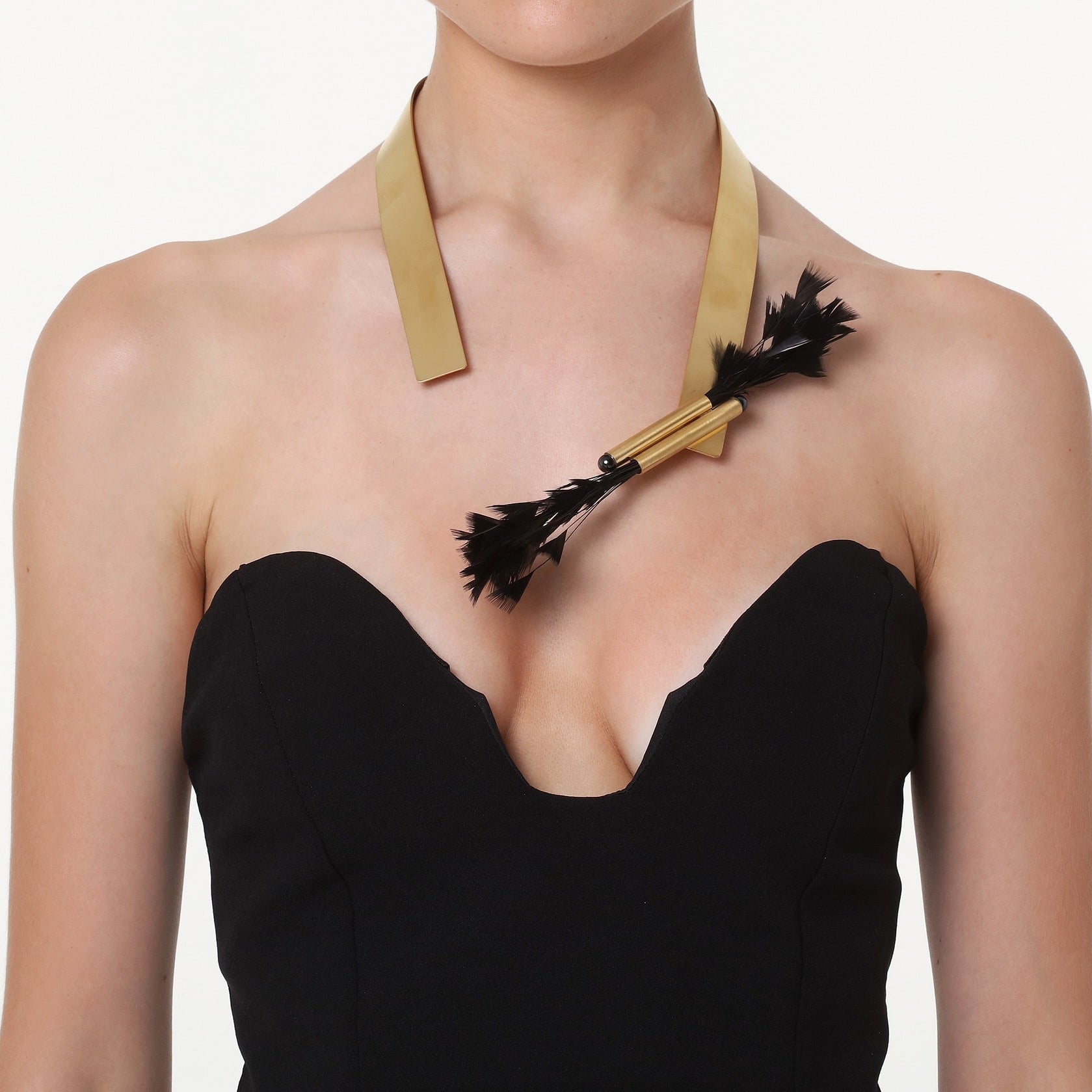 Austeritatea netedă a metalului se învârte în jurul gâtului, terminându-se în natura jucăușă a penelor. Un colier care pune în valoare farmecul contrastelor de textură și surprinde prin inspirația sa. O piesă atrăgătoare care devine vedeta ținutei.